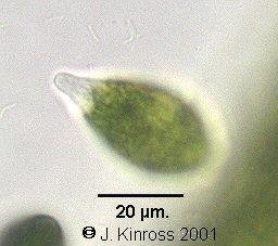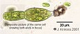 This picture shows a zoospore which has settled on an Oedogonium filament.