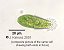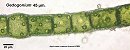 Oedogonium species are unbranched filamentous green algae. There is a dense chloroplast, usually filling the cell, with pyrenoids. Cells frequently are wider at one end than the other; occasionally one finds bulbous, almost globular cells. The chief diagnostic character is the presence of rings at the wider end, which arise as a consequence of cell division, one ring per division which that cell has undergone, which can usually be seen in the filament by careful focussing under favourable lighting (condenser iris shut down). Oedogonium reproduces sexually as well as vegetatively, and the larger female plant may carry a much smaller male plant attached to it.